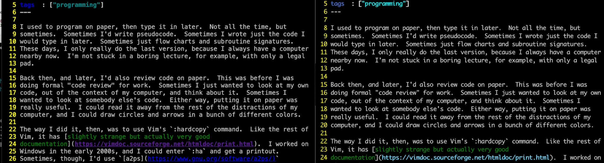 The real problem, for fixing the colors, is that I use a dark-background color scheme in Vim. Printing tries to emulate your color scheme, but has to correct for the fact that it’s going to print on white paper. The real answer is to have an alternate color scheme ready for printing.